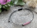 Minimalistický šňůrkový náramek z růžových mini skleněných broušených korálků (cca 2 x 3 mm) a stříbrných nerezových kuliček na černé syntetické šňůrce.