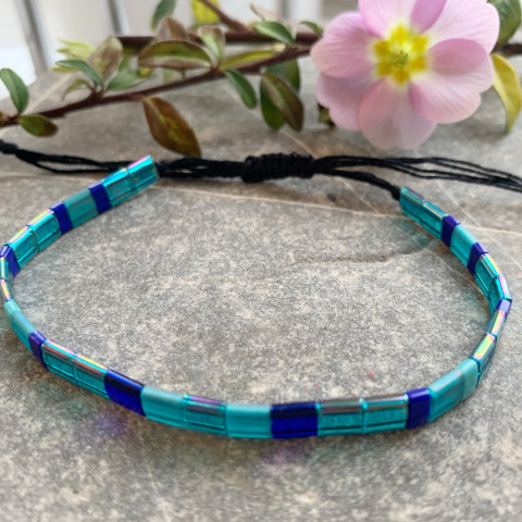 Náramek z luxusních japonských skleněných korálků Miyuki Tila (dvoudírkové korálky 5 x 5 mm) na černé bavlněné šňůrce. Délka korálkové části 15 cm.