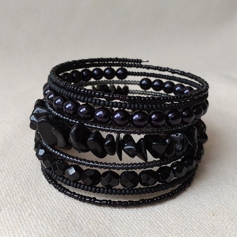 Masivnější náramek v tajemné černé barvě. Kombinace různých velikostí skleněných korálků a onyxu v provedení přírodní polodrahokam.