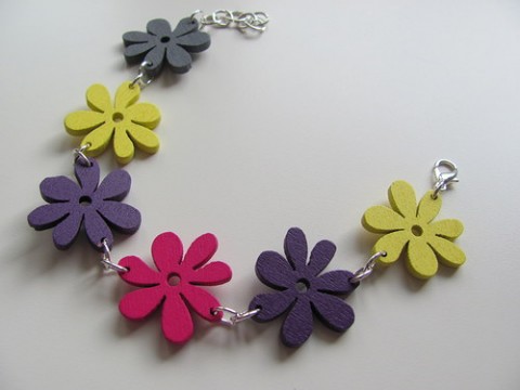 Dřevěné kvítky 1x růžový, 2x fialové, 2x žluté a 1x šedý.