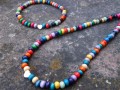 Náramek je vyrobený z malinkých barevných dřevěných korálků a malého perleťového srdíčka