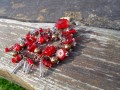 Bohatý náramek z průhledných a červených skleněných korálků a korálků a komponentů staroměděné barvy měří včetně zapínání 20 cm. Délku lze díky řetízku zvětšit o cca 2 cm.