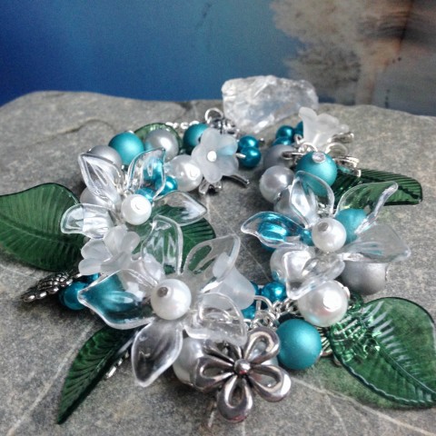 Cinkací výrazný náramek z bílých, tyrkysových a stříbrných voskovaných korálků, průhledných květinek, tmavě zelených lístečků a přívěsků v barvě platiny. Zapínání karabinka, délka náramku 18 cm + prodlužující řetízek