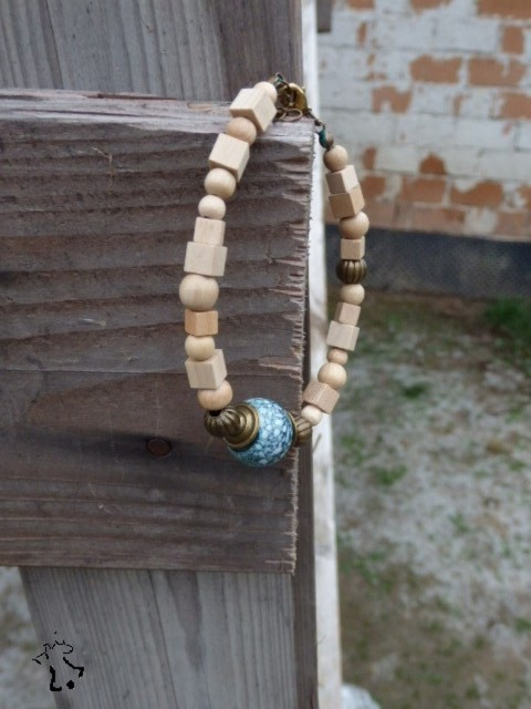 Náramek z dřevěných korálků různých tvarů a velikostí doplňuje keramická kulička a kovové korálky staromosazné barvy.