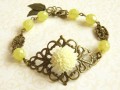 Romantický květinový náramek s chryzantémkou ve světlé vanilkové barvě. Doplněno voskovanými ohňovkami a filigrány. Staromosazné komponenty, zapínání na karabinku, délka náramku 18 cm + 3 cm prodloužení.