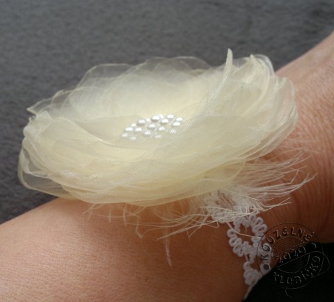 Květ je vyroben z organzy smetanové/champagne barvy, zdobený perličkami a peříčky v barvě květu, začištěný filcem, připevněný na jemné bílé elastické krajce. PROSÍM O OBVOD ZÁPĚSTÍ!!! Lze vyměnit za stuhu a náramek zavazovat.