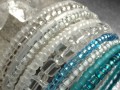 Náramek z paměťového drátu, kostiček křišťálu, bílého, čirého a tyrkysového rokajlu a tyčinek. 11 otoček, průměr 6 cm, šířka cca 4,5 cm