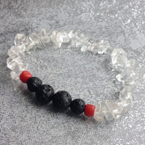 Náramek ze zlomků křišťálu, lávových kuliček a kousků červeného korálu. Náramek je pružný - cca 17 - 18 cm