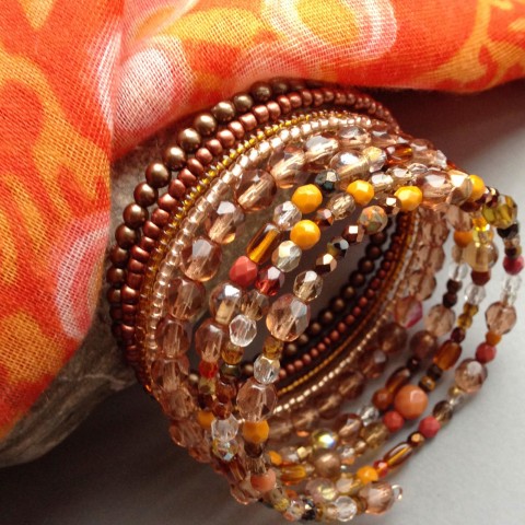 Náramek z paměťového drátu, rokajlu a skleněných broušených korálků. 8 otoček, šířka 4 cm, průměr náramku 6 cm