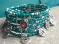 Náramek z paměťového drátu, tyrkysového a stříbrného rokajlu a kovových přívěsků - penízků. 8 otoček, průměr 6 cm