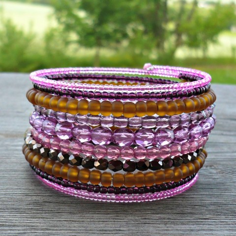 Skleněné korálky růžových, fialových a hnědých odstínů jsou navlečeny na deseti řadách paměťového drátku (= i přes velké roztažení se náramek vrátí do původního tvaru).