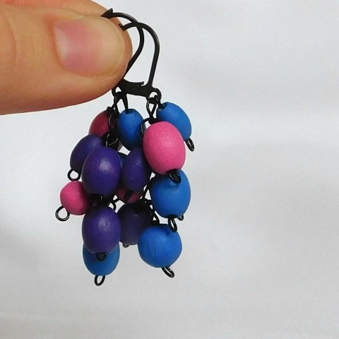 Náušnice z modrých, růžových a fialových dřevěných korálků. Černý drátek a háček do ucha, délka bez háčku cca 3,5 cm.
