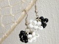 Náušnice z černého a bílého rokajlu na stříbrných kroužkách. Šířka hroznu cca 2 cm, délka od háčku 1,5 cm. Komponenty a háček běžný kov ve stříbrné barvě, gumové zarážky.