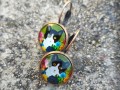 Kabošon s obrázkem, vlepený do náušnicového lůžka z bižuterního kovu.