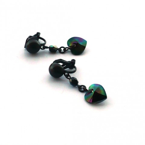 Precizně vybroušené malé Swarovski srdíčko v odstínu crystal rainbow dark (měnivé barevné - barva jde dobře vidět na titulní fotografii - na fotu s dárkovou krabičkou je jiný odstín) a černý skleněný broušený korálek s barevným efektem jsou zavěšeny na klipsovém zapínání - na toto zapínání není potřeba mít propíchnutá ouška. V případě zájmu přendám na zapínání pro propíchnutá ouška.
