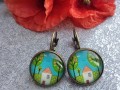 Náušnice v barvě mosazi se skleněným kabošonem a motivem stromů s domečkem.