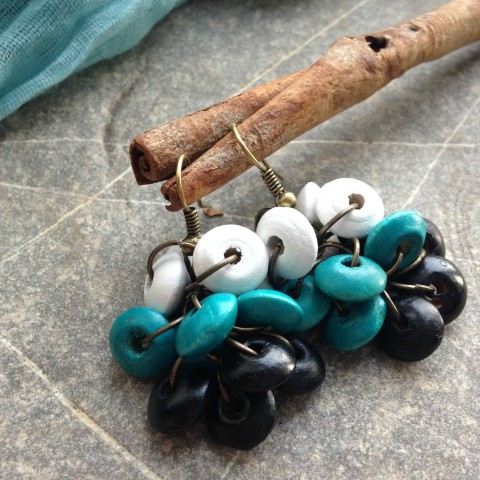Náušnice z dřevěných tyrkysových, černých a bílých disků a mosazných kroužků. Délka od háčku 3 cm, gumové zarážky