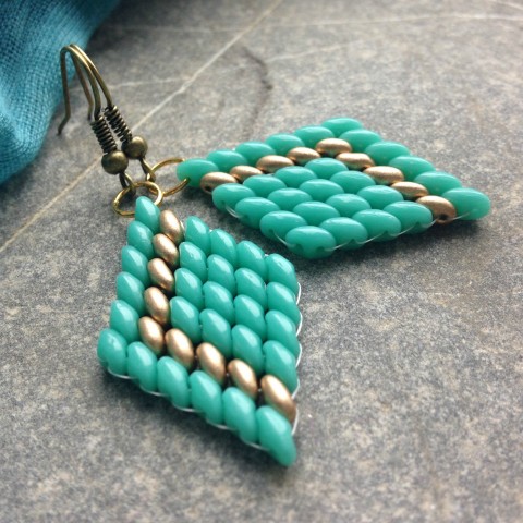 Šité náušnice z tyrkysového a zlatého superdua - twinů ve tvaru kosočtverce. Háček v barvě mosazi, běžný kov, gumové zarážky. Délka od háčku 3,5 cm