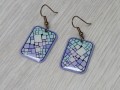 Náušnice ve tvaru obdélníku s mozaikovým vzorem v odstínech fialové a světlé mátové.