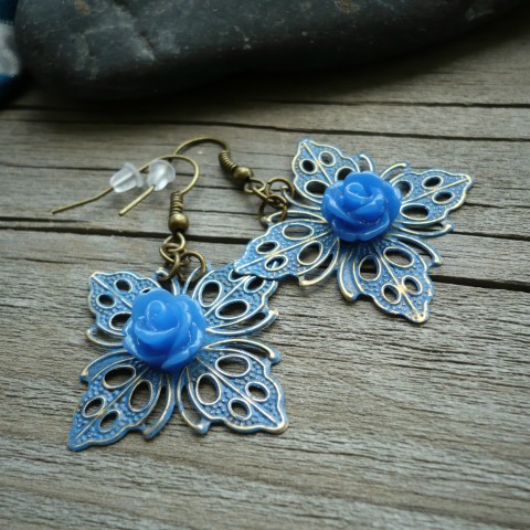 Náušnice - mosazné čtvercové filigrány s nalepenou resinovou růžičkou zavěšené na mosazném háčku. Velikost filigránu 2,5 cm, gumové zarážky. Filigrán je jemně napatinován tmodrou patinou