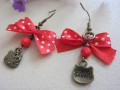 Náušnice jsou vytvořeny ve stylu vintage z komponentů z obecného bižuterního kovu v úpravě starobronz a z červeno bílé stužky - ručně vyrobené mašličky a českých skleněných červených ohňovek - korálků, jsou zavěšeny na afroháčcích s kuličkou a pružinkou, které budou dodány se silikonovými zarážkami proti ztrátě.
