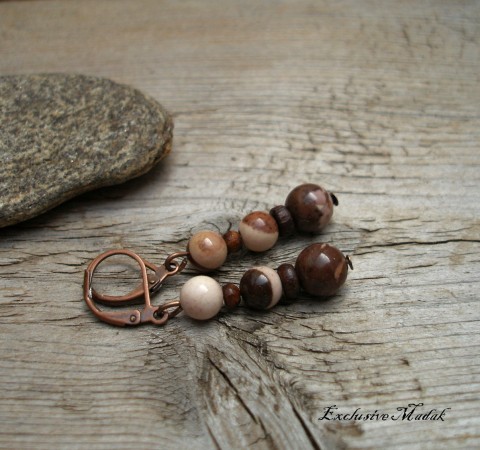 Přírodní náušnice starobylého vzhledu s miner. korálky jaspisu capucino a dřevěnými korálky + náušnicové zapínání staroměď.