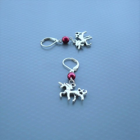 Nejen dětské náušnice z horní vínově červené české voskované perličky a spodního kovového oboustranného přívěšku v podobě jednorožce.