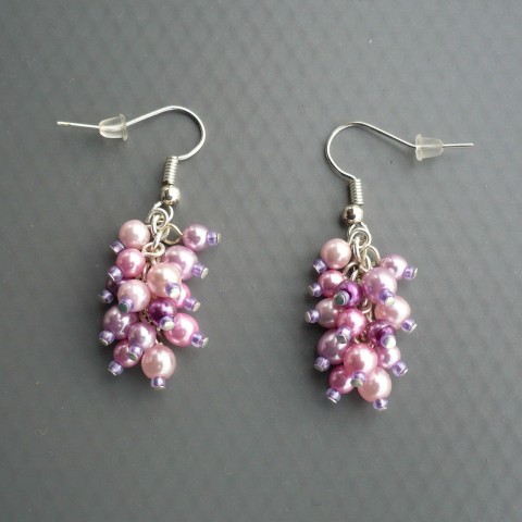 Náušnice jsou tvořeny z fialových a růžových voskovaných perliček, které jsou uspořádané do jemného hrozínku.