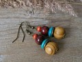 Náušničky z dřevěných korálků v barvách natur, tyrkysová a bordo. Doplněno staromosaznými kroužky a kaplíky.