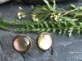 Náušnice - puzetky v barvě mosazi, běžný kov s dobarveným skleněným kabošonem.