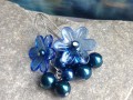 Visací cinkáčkové náušnice - voskované kuličky modré barvy a modrá plastová kytička. Delší uzavíratelný háček a komponenty v barvě platiny - běžný kov. Celková délka 6 cm