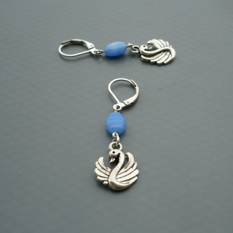 Lehoučké nejen dětské náušnice z žíhaného modrého plochého skleněného oválku a ozdobného bižuterního komponentu v podobě oboustranné labutě starostříbrné barvy.
