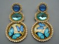 Velké výrazné náušnice z modrých kamínků obklopené čirými štrasovými kamínky, které jsou zasazené v kotlíčkách zlaté barvy, jsou upevněné na textilním podkladu. Dominantní částí je největší kamínek, jež je s motýlkovým motivem.