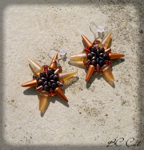 náušnice šité ze skleněných korálků: spike, rulla, super duo, rokajl Toho a Pellet