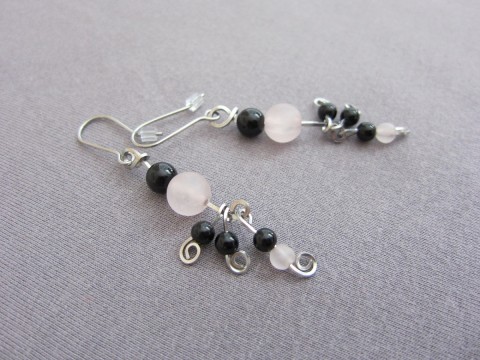 Náušnice jsou vytvořeny z profilovaného nerezového drátku a kuliček černého onyxu a matovaného růžového růženínu, zavěšené na kulatém nerezovém háčku se silikonovými zarážkami.