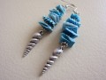 Náušnice jsou vytvořeny z komponentů z obecného bižuterního kovu v úpravě starostříbro, jsou zavěšeny na afroháčcích s kuličkou, které budou dodány se silikonovými zarážkami proti ztrátě a z přírodních kousků mušliček barvených na tyrkysovou modrou.