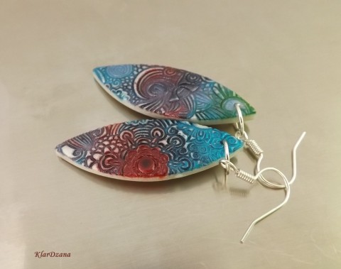 Barva polymerových částí: perleťový podklad (zadní strana nebarvená) se strukturou a barevnými inkousty (tyrkysově modrá, modrá, zelená, vínově červená). Barvy se mohou lišit v závislosti na okolním světle (nebo na nastavení monitoru v případě zde uvedených fotografií) - náušnice působí chladným, vkusným dojmem - červená není zářivá v reálu.