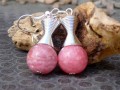 Náušnice tvoří výběrové kuličky rodochrozitu, které jsou zavěšeny pod spirálovitým ozdobným kaplíkem uzavřeným růžovou perličkou