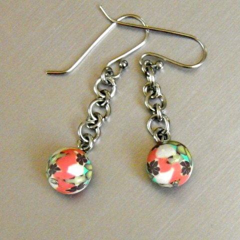 Náušnice s malovaným keramickým korálkem ze švédského ateliéru Barbro Bohlin. Jsou vytvořené z drátu z nerezové oceli a nerezového zapínání. Délka náušnice bez zapínání je 3 cm, náušnicový háček je také z nerezové oceli a je dostatečně dlouhý, aby náušnice nevyklouzla z ucha. Přesto přikládám plastovou zabezpečovací zarážku. Vhodné pro alergiky.