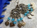 Výrazné náušnice s mosazným filigránovým ramínkem a zavěšenými tyrkysovými skleněnými korálkami se srdíčky. Délka od háčku 5,5 cm.