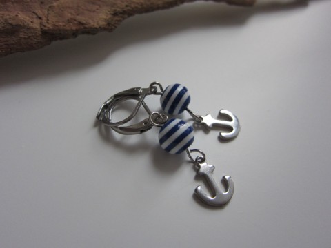 Náušnice jsou vytvořeny z háčků z chirurgické ocele a z nerezových komponentů v barvě platiny (vhodné pro alergiky) a z plastových pruhovaných bílo modrých korálků.
