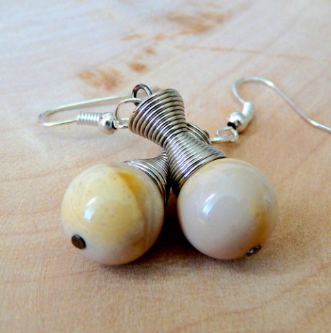 Náušnice tvoří výběrové kuličky mokaitu v mléčné barvě se žlutým a hnědým kontrastem, které jsou zavěšeny pod spirálovitým ozdobným kaplíkem uzavřeným dřevěným korálkem v přírodní barvě