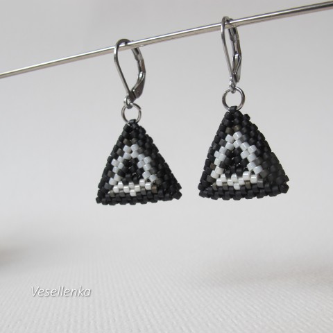 Naušnice zhotovené technikou beadweving - šití korálků. Korálek po korálku jsou šité ručně syntetickou profesionální "nepřetrhnutelnou" nití NYMO, použity jsou kvalitní japonské TOHO beads. Trojúhelníčky jsou dvouvrstvé, proto mnohem lépe drží tvar, ale přesto jsou lehoučké. Zavěšené jsou na zavíracím zapínání z chirurgické oceli.