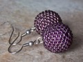 Ručně šité náušnice jsou vyrobené z fialového rokajlu se stříbrným průtahem. Základ náušnic tvoří dřevěná kulička. Použité komponenty jsou v barvě platiny. Náušnicové háčky jsou z chirurgické oceli. Součástí náušnic jsou i gumové zarážky.