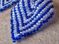 Šité náušnice ve tvaru lístku jsou vyrobené z tmavě modrého transparentního rokajlu, z průhledného rokajlu s leskem a z broušených čirých ohňovek - průhledný crystal. Použité komponenty jsou v platinové barvě. Součástí náušnic jsou gumové zarážky.