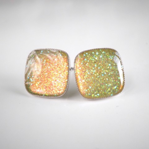 Náušnice puzety ve tvaru čtverečku se zaoblenými rohy, zalité křišťálovou pryskyřicí s glitry.