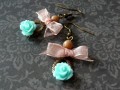 Starobylé náušničky s resinovou mentolovou růžičkou, kterou doplňuje světle růžová mašlička a béžová perlička. Staromosazné komponenty, délka náušniček 4,5 cm včetně háčků.