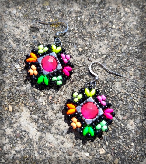 náušničky šíté z rokajlu Preciosa a Toho, doplněno o mačkané korálky s UV efektem a komponent z bižuterního kovu