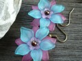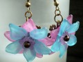 Náušnice z plastových kytiček růžové a modré barvy s mosaznými komponenty. Háček v barvě mosazi, běžný kov, gumové zarážky. Velikost kytiček je cca 3 cm.