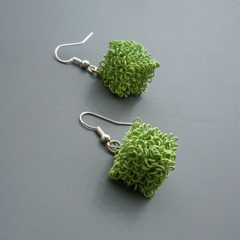 Jednoduché náušnice jsou tvořeny šestistrannou pastelově zelenou kostkou vytvořenou z kudrnatého drátku.